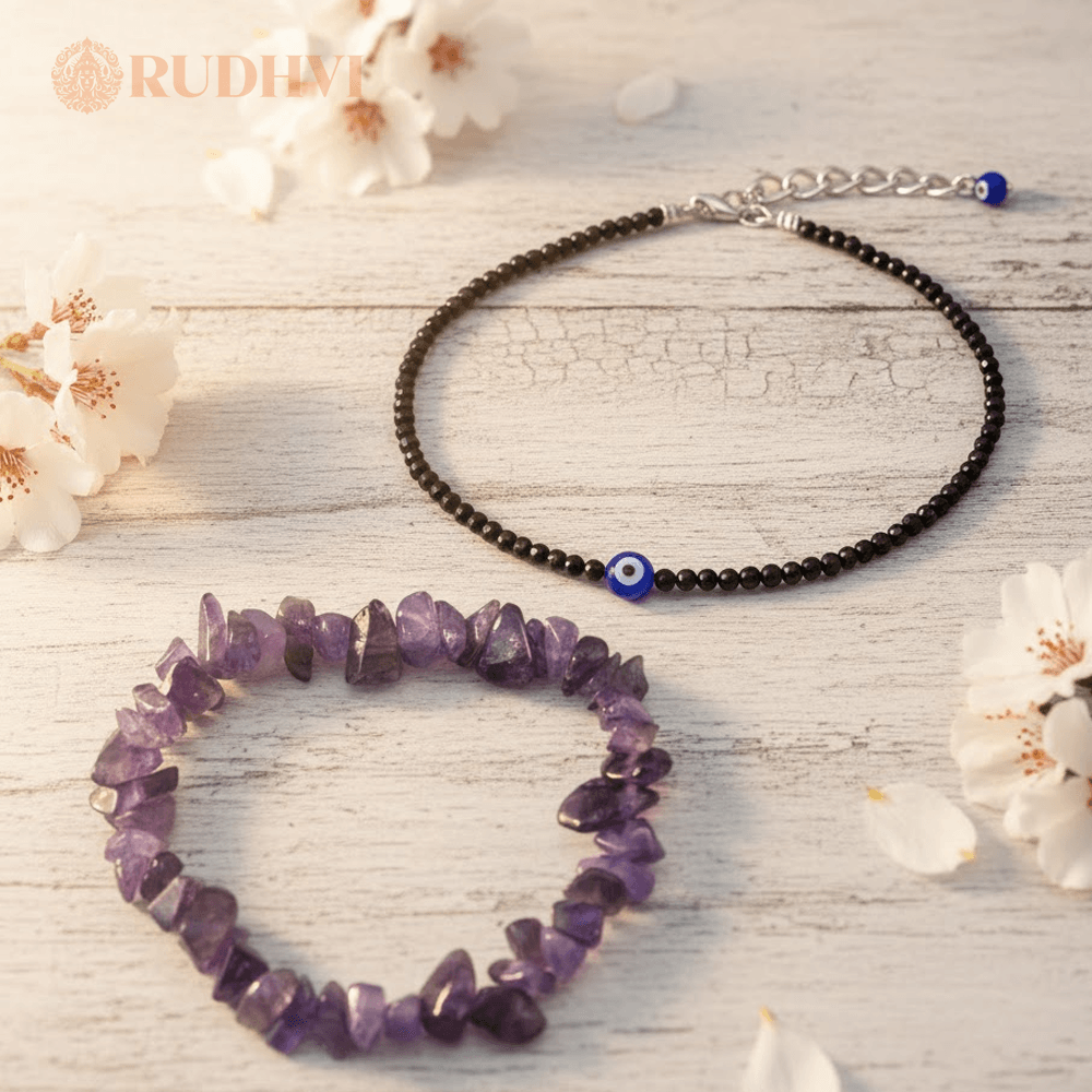 Discover inner peace and divine protection with Rudhvi’s Amethyst Chips Bracelet x Black Tourmaline Evil Eye Anklet Duo — a sacred combination designed to keep your mind calm, your aura protected, and your energy pure.