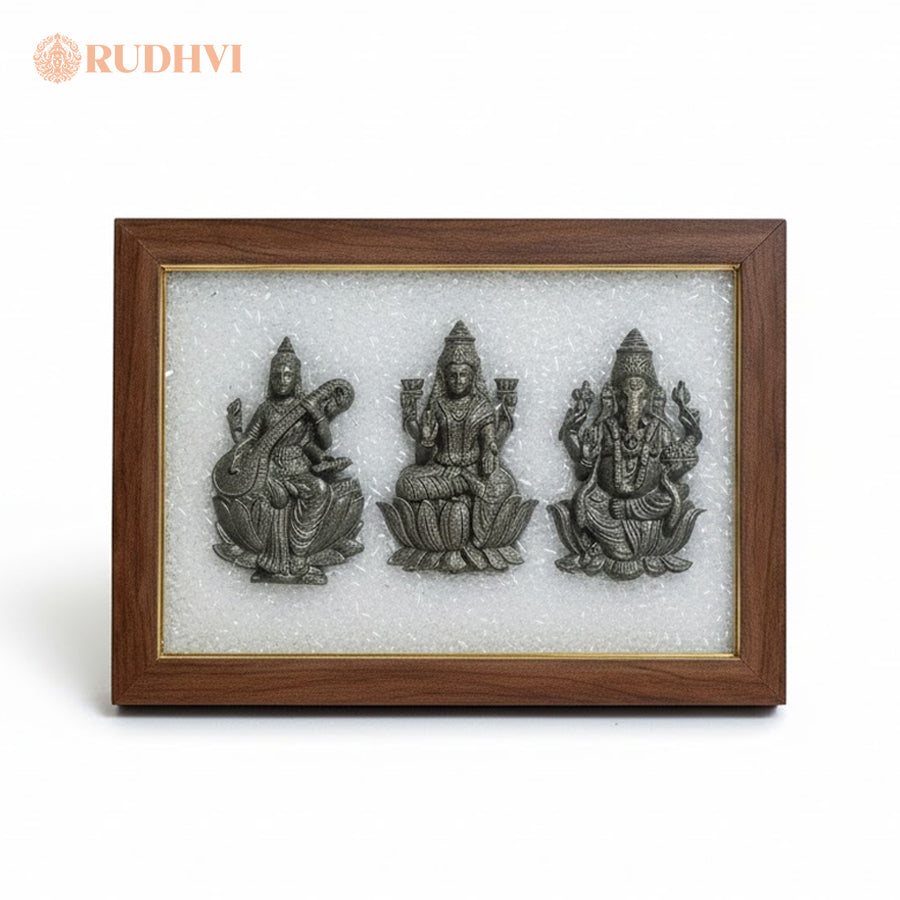 Pyrite Lakshmi Ganesh Saraswati Idol with Selenite Frame – Wealth, Wisdom & Protection